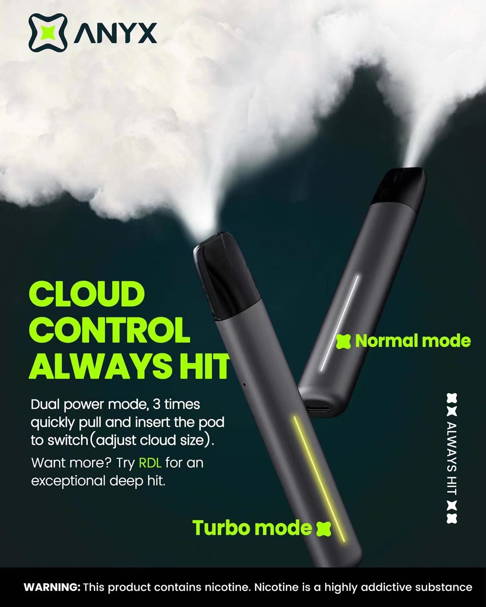 Raws li lub ntiaj teb thawj qhov tseeb dual-hom kaw lub kaw lus, ANYX PRO tau nruab nrog MCU ntse ntsuas kub tswj nti thiab txhawb nqa Txoj Kev Txwv Direct-Lung (RDL) hom, xa cov kev paub tam sim tab sis tseem ceeb sib txawv, nyob ntawm hom xaiv: lub muaj zog thiab ntom saj ntawm Turbo hom, nrog rau qhov muag heev thiab muag muag ntawm Hom Hom. ANYX PRO yog tsim los ua kom txaus siab rau ntau yam kev nyiam ntawm vapers, cog lus tias yuav muaj kev paub ntau dua.