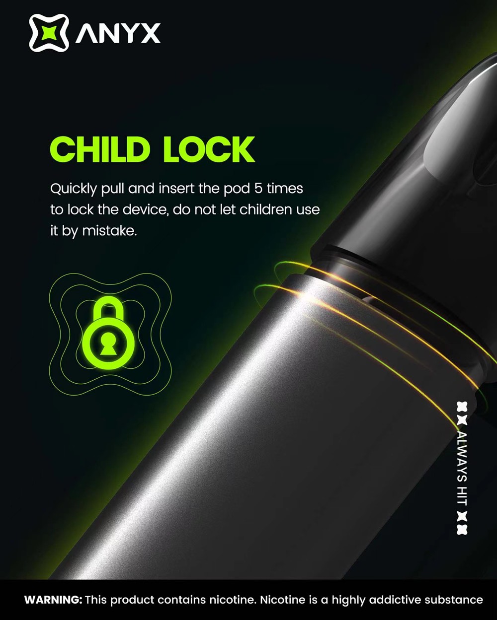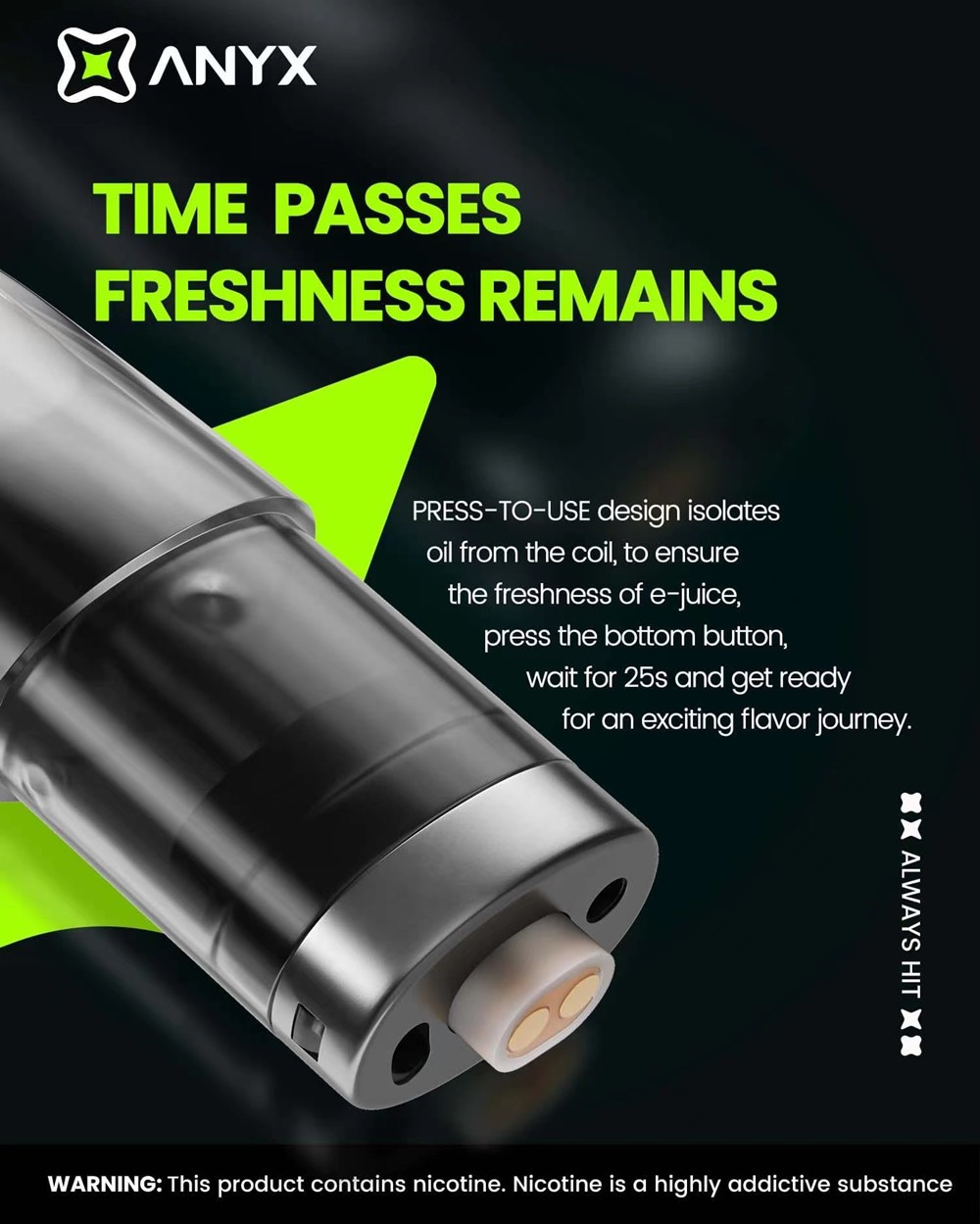 Cov kws tshaj lij kev lag luam thiab cov neeg paub txog vapers tau txais kev qhuas los ntawm ANYX pro pod system vape lub ntsej muag zoo nkauj thiab xis nyob. Kev sib xyaw ua ke ntawm lub cev hlau thiab lub teeb ntws uas flickers ntawm qhov zaus tas mus li thaum cov neeg siv nqus cov vapor ntxiv rau cov khoom tsim ergonomic nrog cov xim zoo heev thiab kev xav zoo.